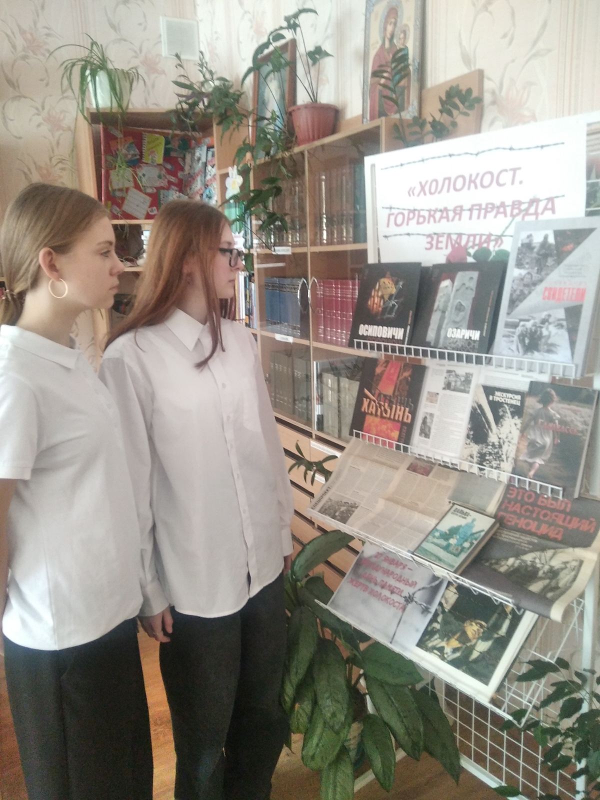 К этому скорбному дню в библиотеке оформлена выставка-память «Холокост. Горькая правда земли». На выставке представлены материалы, рассказывающие о массовой гибели мирного населения в лагерях смерти, о жизни и страданиях людей на оккупированных территориях, в том числе на белорусской земле.
