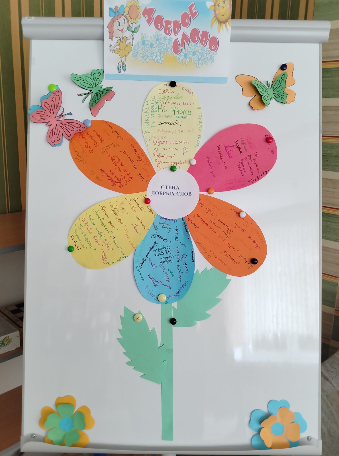 В школе прошла удивительная Акция "Стена добрых слов". Учащиеся с удовольствием писали на лепестках цветка тёплые и добрые слова, от которых на душе становится теплее, которые могут поддержать в трудную минуту, заставить улыбнуться. В результате получился чудесный цветок- замечательная коллекция тёплых слов. Акция направлена на поощрение доброты, внимания и взаимопомощи среди наших ребят, призвана вдохновлять нас всех на добрые поступки, поддерживая и уважая друг друга.