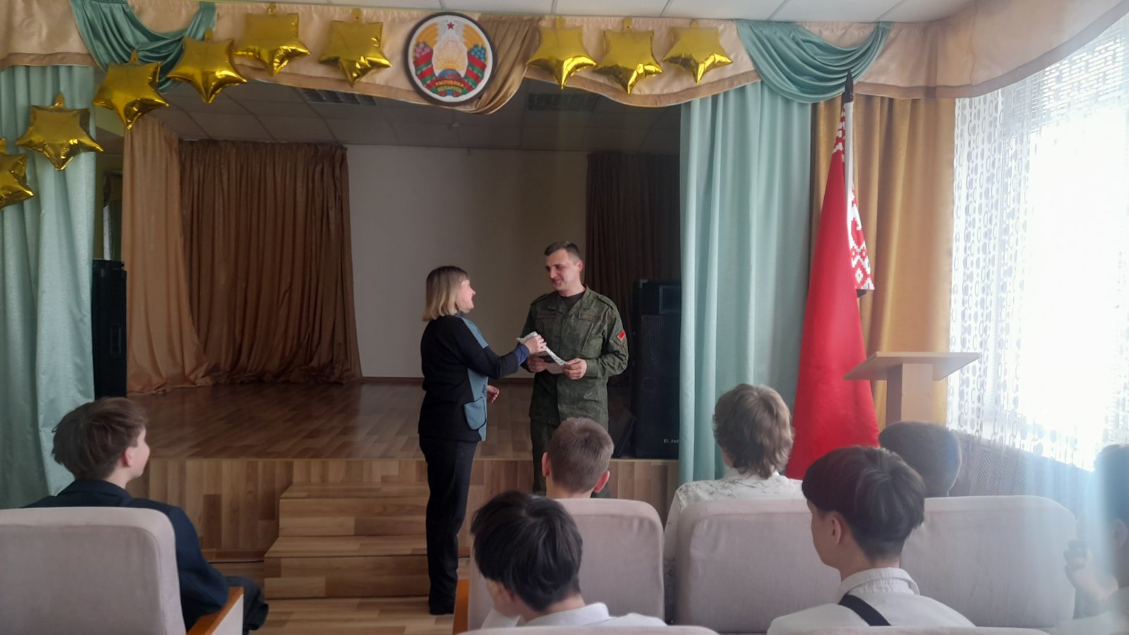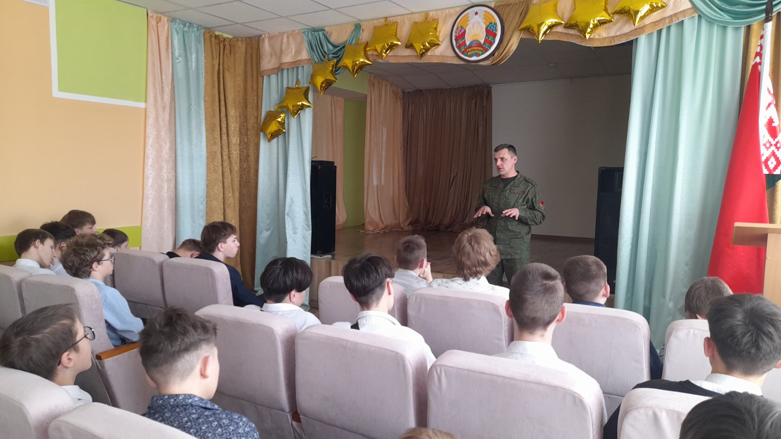 В настоящее время государственная политика Республики Беларусь направлена на повышение престижа военной службы. Он рассказал о порядке прохождения воинской службы, основаниях и условиях освобождения от воинской службы, а также о возможности служить в армии по контракту. Внимание учащихся было обращено на возможность поступления в высшие военные учреждения образования. В завершение встречи, Евгений Александрович ответил на интересующие учащихся вопросы.